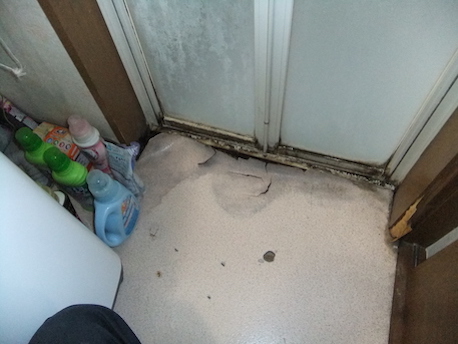 脱衣場床の腐食部補修工事「木下地、床造作、CF貼り」、軒天換気口 更新、電気主線 サドルバンドSUS更新、換気口 SUS製品へ更新